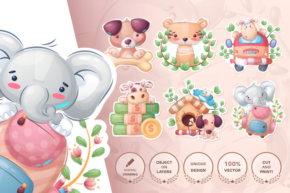 – 6 Vector “6 cute stickers” files (EPS10+AI) format files of every files (so easy to customize colors, mix and match patterns, resize and rotate them, then apply easy to any size area.)